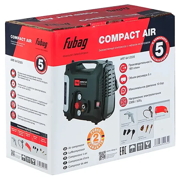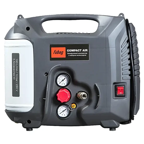 Купить Безмасляный компрессор FUBAG Compact Air + набор из 5 предметов в Иркутске легко — просто позвоните по телефону: 8-800-551-11-01
