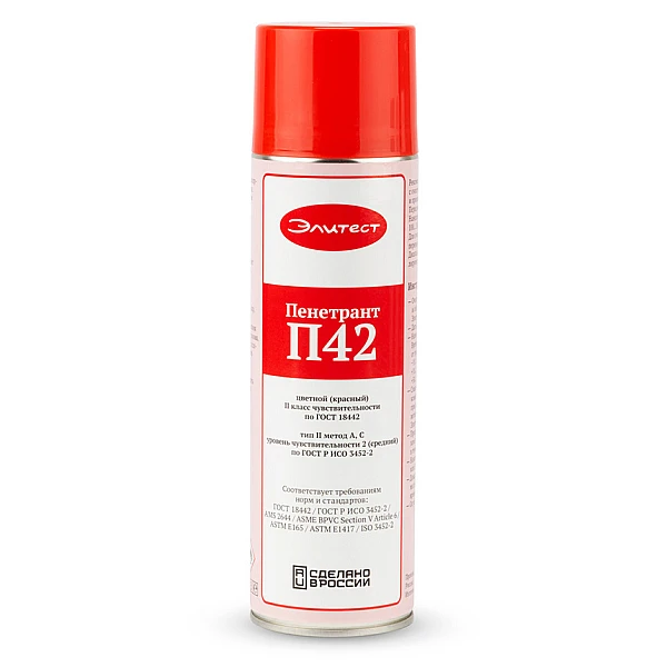 Красный пенетрант Элитест П42 применяется при капиллярном контроле в качестве проникающей индикаторной жидкости. Изготавливается в России, в соответствии с ТУ 2499-001-49782089-2015.