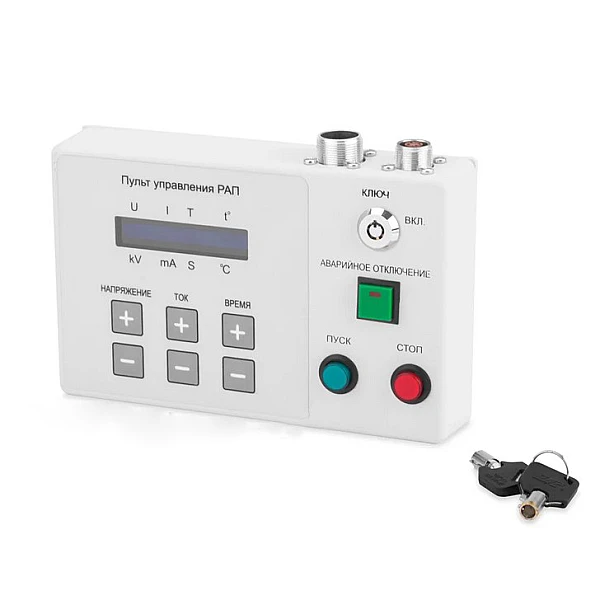 Пульт управления оснащен замком безопасности, что исключает возможность несанкционированного запуска рентгеновского излучения. В верхней части пульта находятся разъемы для подключения к блоку питания и блоку сигнализации. На дисплей пульта управления выводится вся необходимая для оператора информация: напряжение на трубке (U, кВ), анодный ток (I, мА), время экспозиции (T, сек.), температура изолирующего масла (t, °C).