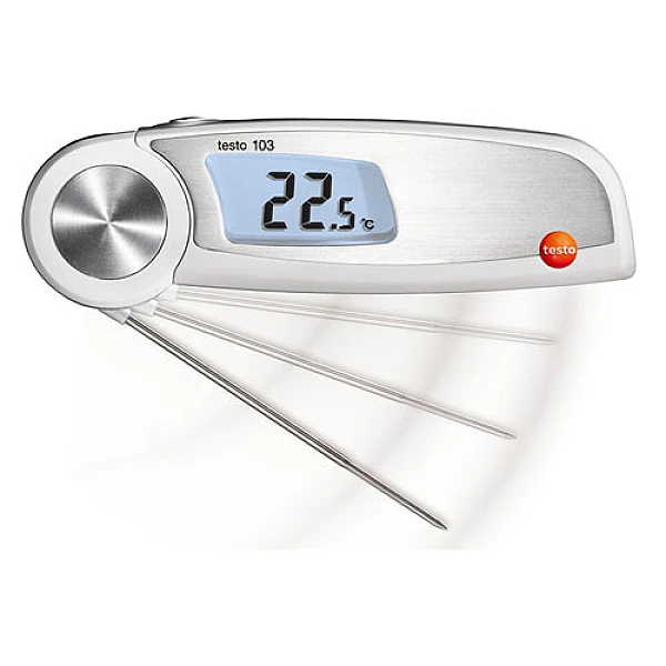 Лицам, инспектирующим предприятия общественного питания (кафе, бистро, рестораны и пр.), а также проверяющим условия хранения продуктов в магазинах и супермаркетах или на производстве, требуется неприхотливый термометр минимального размера и веса, удобный для переноски. Однако термометр контактный, предназначенный для измерения внутренней температуры пищевых продуктов и блюд, не может иметь слишком короткий прогружной зонд, так как замер должен проводиться на определенной глубине. Поэтому специалистами немецкого концерна Testo AG была разработана модель складного термометра Testo 103, длина которого в сложенном состоянии составляет всего 11 см (при длине зонда 75 мм).